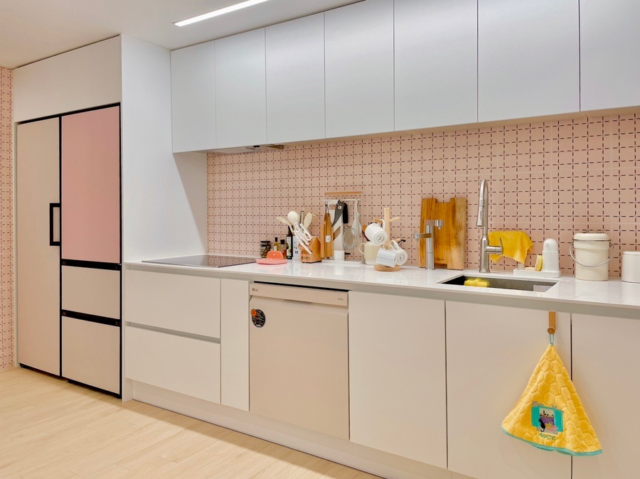 LG 오브제 컨버터블 냉장고를 사용한 지 2년이 되어 가요 냉장고의 갑작스러운 흩날림이 싫어서 인테리어 공사를 하면서 키친 핏으로 계획을 세웠습니다.오브제 컨버터블 냉장고 3대를 나란히 연결하고 싶었는데 주방 조건이 허락되지 않아서요.원래 첫 번째 디자인은 지금의 팬트리 선반 위치에 두는 것이었는데 그 안에 인터넷 단자함이 뻥 뚫려 있어서 큰 냉장고를 둘 수 없는 상황… 20년 가까이 살던 집이라 구조에 변화를 주고 싶었는데 어쩔 수 없이 냉동고 한 대를 포기하고 원래 냉장고 자리인 이 위치에 김치냉장고와 냉장고 두 대를 연결할 수밖에 없었어요.
